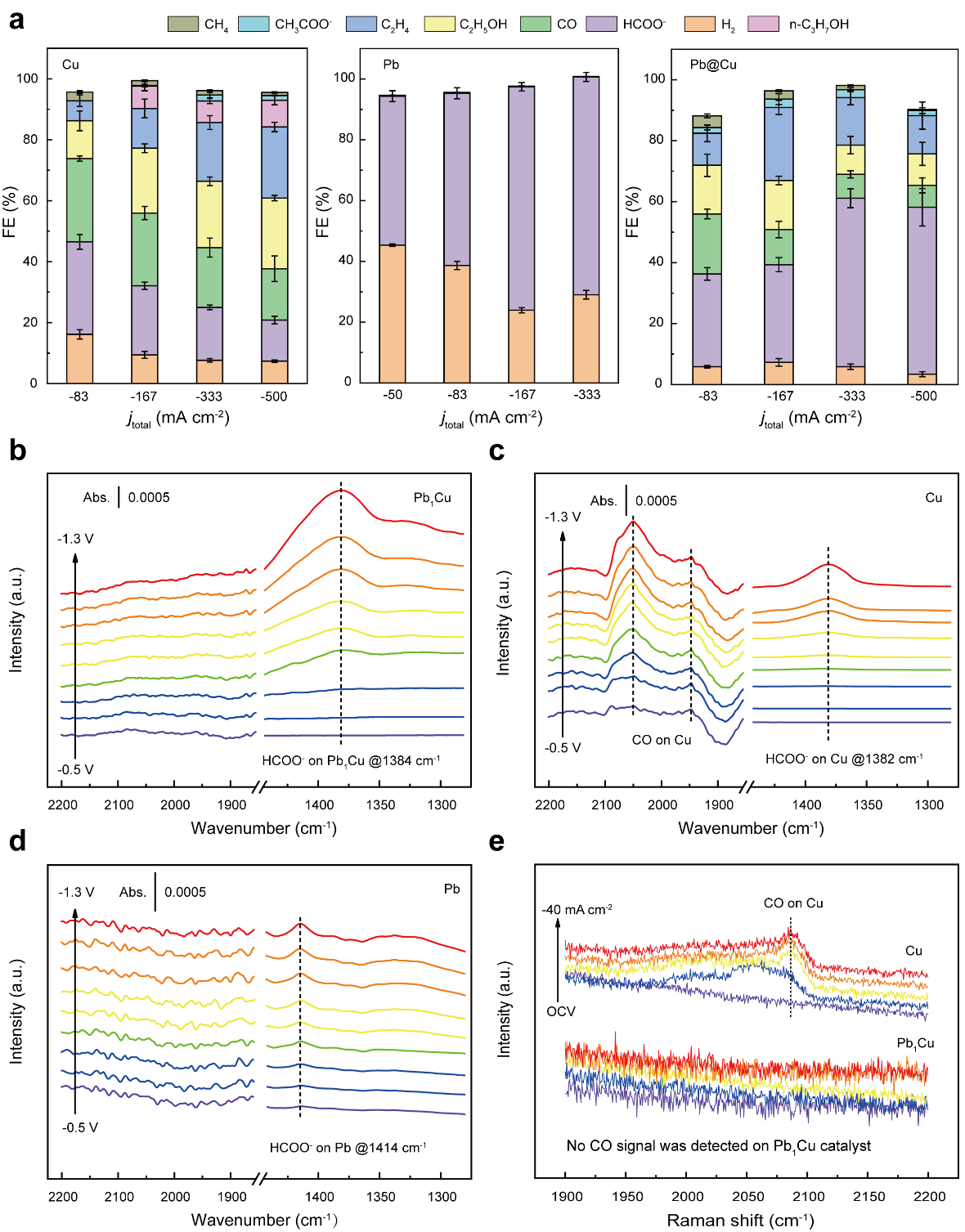 图4.铅单原子修饰的铜催化剂的二氧化碳电还原机理实验和谱学研究