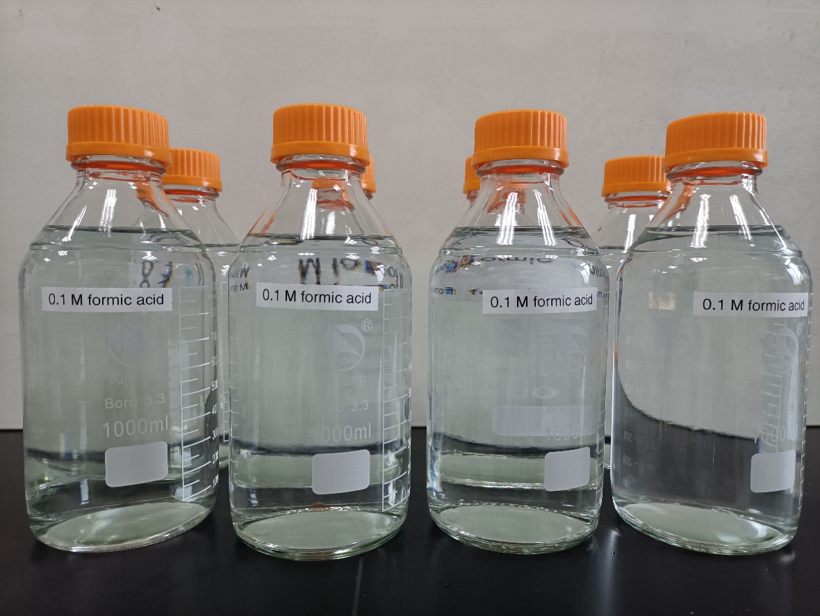 图3.借助固态电解质技术合成的8升浓度为0.1摩尔每升的纯甲酸水溶液的照片