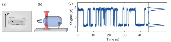 (c)一个典型的马达转向改变信号。纵轴代表光镊x信号输出,右边是对应的信号统计图。上述研究得到了国家自然科学基金委、科技部、合肥大科学中心协同创新培养基金、博士后创新人才计划的支持。