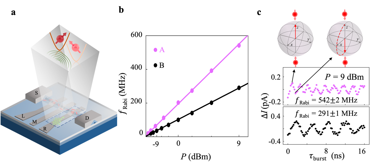 图1. (a)硅基锗量子线空穴双量子点和自旋比特操控示意图,(b)自旋比特翻转速率随微波功率增加而增加, (c)微波功率为9dBm时,自旋比特操控速率可达542MHz。