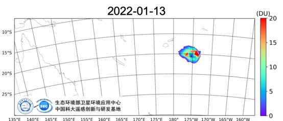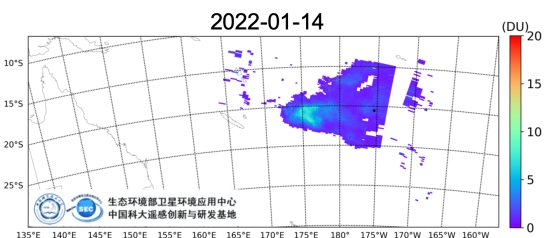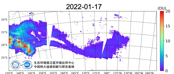 1月17日,汤加火山喷发的SO2羽流继续向西飘移(图7)。