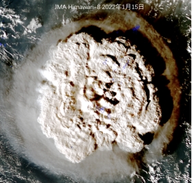 1月13日至17日,南太平洋汤加洪阿哈阿帕伊岛附近海域的海底火山(20.54° S, 175.38°W)发生大规模喷发。从喷发规模和爆炸的横向蔓延来看,这可能是自1991年皮纳图博火山喷发以来强度最高的一次火山事件,大量喷发物覆盖了汤加上空(图1、图2)。
