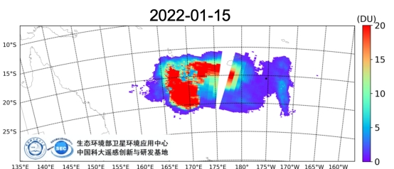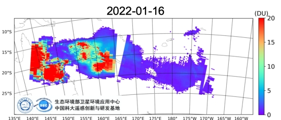 中国科学技术大学工程科学学院与生态环境部卫星环境应用中心共建的大气环境遥感创新与研发基地采用完全自主开发的大气污染物超光谱遥感算法,成功捕获1月汤加火山喷发产生的大量二氧化硫(SO2)烟羽分布。