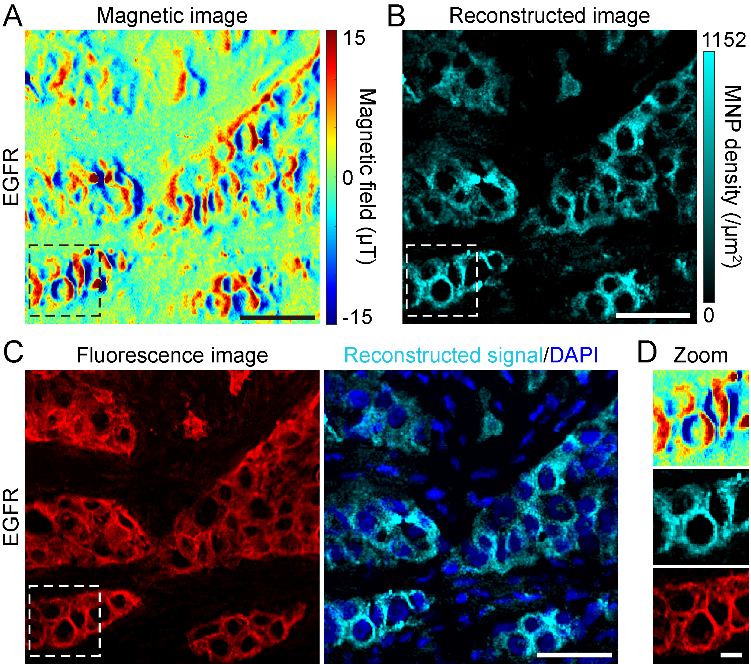 本研究的新方法主要有四个优点:1、绝对磁定量。磁成像的信号来自相同大小纳米磁颗粒的局域磁场,具有可绝对定量的量纲,所以通过磁场强度的计算能实现绝对定量(图2B),准确性高。2、能避免背景信号的干扰。生物样本自身一般都没有磁场背景,而磁成像方法的频谱测量方式能有效抵抗组织中的自发荧光的影响,所以能提供纯粹的肿瘤标志物信息和很高的图像对比度(普遍比荧光方法高5倍以上),同时贡献于定量的准确性。3、磁信号的高稳定性。磁标记好的生物样品在室温大气环境下放置一年半后,检测发现磁场信号的分布和强度都没什么变化,这方便了临床样品的长期保存和重复检测。4、磁和光多模态成像。磁和光是两个不同的物理量,该研究中的磁成像可以与传统光学成像联用,实现对同一组织切片的形态特征和肿瘤标志物的检测,这对分析肿瘤的微环境和异质性具有重要意义。