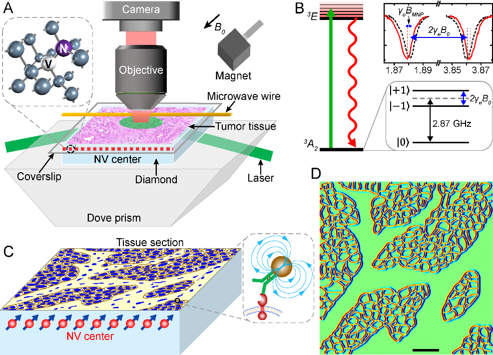 中国科学技术大学中科院微观磁共振重点实验室杜江峰、石发展等与生命科学与医学部魏海明教授等合作,在金刚石氮-空位色心量子精密测量技术的生物医学应用方面取得重要进展,首次建立了肿瘤组织免疫磁显微成像技术,实现了组织水平微米分辨率的磁成像,其具有高稳定性、低背景和肿瘤标志物绝对定量的优势,同时实现了磁和光的多模态成像。相关研究成果于2022年1月26日以“Immunomagnetic microscopy of tumor tissues using quantum sensors in diamond”为题发表在《美国国家科学院院刊》上[Proc Natl Acad Sci U S A 119(5),e2118876119(2022)]。