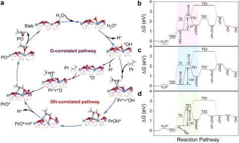 图1. 丙烯电化学催化氧化制环氧丙烷反应路径及不同晶面上的反应能垒。