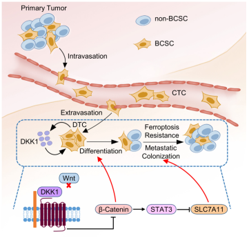 铁死亡是一种非凋亡的细胞死亡过程,与细胞的异常代谢及脂质过氧化相关。相较于原位乳腺癌,肺转移灶处于高活性氧及高铁死亡的压力下。本研究表明,肿瘤干细胞由于其高侵袭特性,在肺转移灶相对富集,富集的肿瘤干细胞可以分泌DKK1负反馈抑制其干细胞特性。由于肿瘤干细胞对铁死亡高度敏感,DKK1调控的肿瘤干细胞特性抑制可以保护肺转移细胞免受铁死亡,促进转移灶的生长。