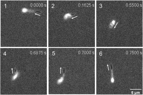 图1.细菌游动的明场及荧光图像。虚线代表细菌胞体,亮色代表荧光标记的鞭毛丝,白色箭头代表细菌游动方向。