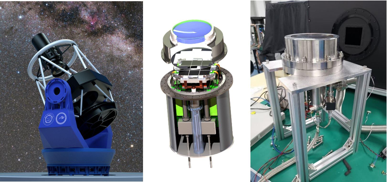 图左:大视场巡天望远镜;图中:主焦相机;图右:CCD290相机