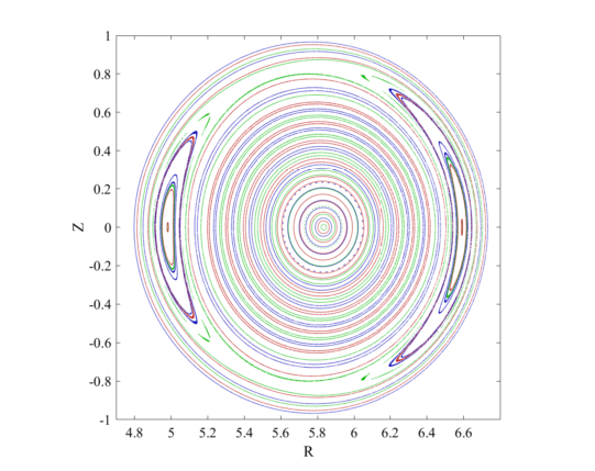 图1.托卡马克中磁岛位型。撕裂模会破坏磁拓扑结构,使得磁力线重新连接形成磁岛,导致等离子体破裂。