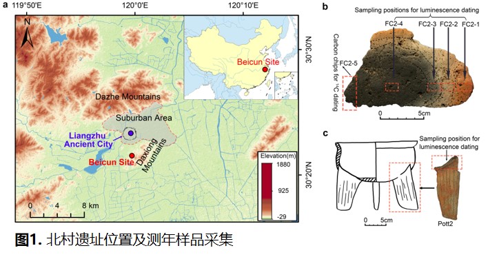 北村遗址是浙江省文物考古研究所2020-2021年发掘的一处良渚文化早期的聚落遗址,目前已发现龙首镯、玉璜、玉蝉和石钺等重要玉器和石器,为研究良渚社会的发展、阶级分化和探索良渚古城的崛起背景提供了最新的资料。为确定北村遗址的绝对年代、探索良渚古城外围遗址的相互关系,中国科学技术大学校科技考古实验室与浙江省文物考古研究所合作对北村遗址中的陶器、红烧土和碳化植物遗存开展了系统的年代学分析,相关成果以Quartz OSL and TL dating of pottery, burnt clay, and sediment from Beicun archaeological site, China为题最近发表在国际年代学一流期刊Quaternary Geochronology上。