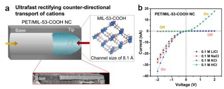蒙纳士大学王焕庭教授研究团队制备了一种由金属有机物框架(metal-organic framework, MOF)和聚对苯二甲酸乙二醇酯(polyethylene terephthalate, PET)组合而成的非均质通道结构。具体做法是将MIL-53-COOH亚纳米通道填充在子弹头形状的PET纳米孔道的尖端,形成MOF亚纳米和PET纳米通道复合的非对称结构。这种非对称的纳米通道同时具备沿尖端向基端的金属离子整流效应和沿基端向尖端的质子整流效应,两种粒子的整流比均达到100以上。同时,该非均质通道结构具有很好的整流稳定性,在苛刻的pH条件和多次重复电压加载中都展现出金属离子和质子的快速整流传输。