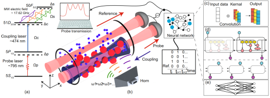 图1 (a)原子能级图。(b)实验装置图。(c-e)为神经网络层的示意图。(c)为一维卷积层(d)为双向长短期记忆层(e)为全连接层。