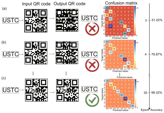 图2 为机器学习解码结果。(a-c)为训练时间不同时,深度学习模型对传输信号的恢复结果。