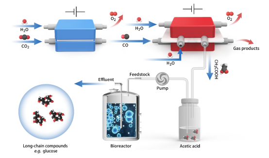 为了规避二氧化碳电还原的产物局限性,可考虑将二氧化碳电还原过程与生物过程相耦合,以电催化产物作为电子载体供微生物后续发酵合成长碳链的化学产品用于生产和生活。而选择合适的电子载体对微生物发酵至关重要。由于二氧化碳电还原的气相产物均难溶于水,生物利用效率低,因此优先选择二氧化碳电还原的液相产物作为生物发酵的电子载体。其中,乙酸是一种优秀的生物合成碳源,可以经发酵转化为葡萄糖等其他生物物质。