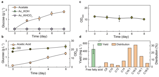 直接电催化转化二氧化碳到乙酸存在着反应速率慢、产物选择性低和碱溶液吸收等诸多问题。鉴于一步法电解的局限性,研究人员提出两步法电解的解决方案,即通过催化剂条件优化和反应器设计,先将二氧化碳高效转化为一氧化碳中间体,再基于固态电解质反应器通过晶界铜催化剂高选择性地合成纯乙酸。乙酸作为优秀的生物合成碳源之一,在细胞体内能有效地转化为乙酰辅酶A进入中枢代谢,通过糖异生、脂肪酸合成等通路实现碳链延伸,合成C6-C18等一系列长链多碳化合物。如图1所示,研究人员将电催化-生物合成结合,且使用巧妙的空间解偶联方式达成电催化上游合成底物,生物合成下游产物转化延伸,实现了“用二氧化碳和水合成葡萄糖和脂肪酸”的全过程。