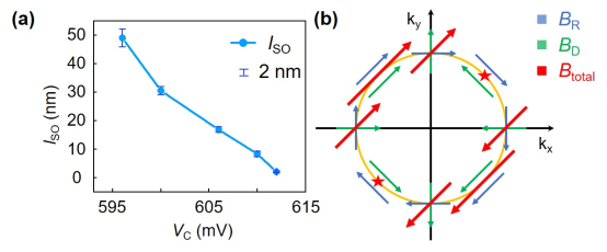 图1. (a)自旋轨道耦合长度(自旋轨道耦合强度的一种表示)随栅极电压VC的变化关系,(b)在动量空间中,不同机制引起的自旋轨道场用不同颜色的箭头表示:蓝色,直接Rashba自旋轨道场(BR),绿色,Dresselhaus自旋轨道场(BD),红色,总自旋轨道场(Btotal)。当BR和BD的幅值相等且方向相反时,红色星星处的总自旋轨道耦合场为零,自旋轨道耦合会被关闭。