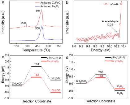 图3.(a)一氧化碳程序升温脱附谱图。(b)光电离能谱图。(c)一氧化碳插入机制能垒。(d)碳化物能垒。