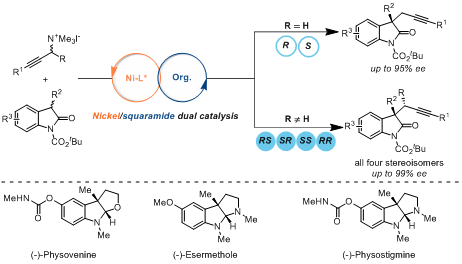 研究人员开发了一种金属/有机小分子协同催化立体发散性合成策略,从相同的反应原料出发,通过改变镍或方酰胺手性催化剂的构型,以高产率、高立体选择性实现炔丙基取代产物所有四种立体异构体的合成(图1)。基于该合成策略,实现了天然产物(-)-Physovenine、(-)-Esermethole和(-)-Physostigmine的立体选择性合成,展现了良好的应用前景。