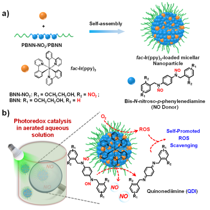 近期,胡进明课题组与刘世勇教授课题组、肖石燕课题组开展合作,报道了一种耐氧型光氧化还原催化调控NO释放的策略,并成功用于细菌感染治疗。以紫外光吸收N,N′-二亚硝基-1,4-苯二胺类光响应NO释放分子(BNN-NO2和BNN)作为研究对象;研究表明,BNN-NO2和BNN在可见光(500 nm)辐照下被光催化剂三(2-苯基吡啶)合铱(fac-Ir(ppy)3)激活并释放NO。有趣的是,NO释放后BNN-NO2和BNN可自发转化为相应的醌二亚胺(QDI)结构,原位清除产生的活性氧(ROS),实现了独特的氧气耐受性能。虽然光氧化还原催化已广泛用于有机合成中,但在生理环境下利用光氧化还原催化反应激活生物活性分子仍然面临巨大挑战——由于生理环境的复杂性,光氧化还原催化反应往往受到周围生物分子的影响 (如氧气会严重淬灭光催化剂的激发态)。