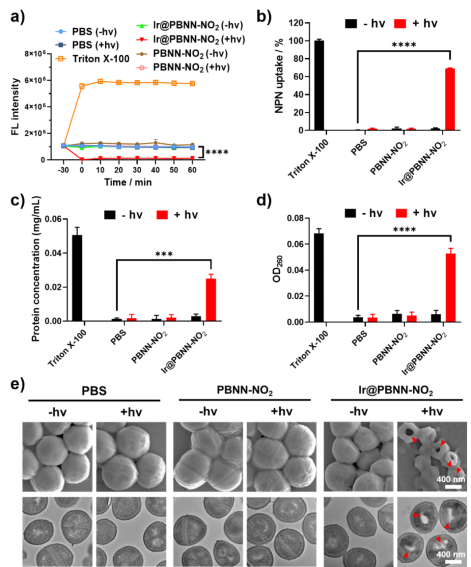 图2、光氧化还原催化触发一氧化氮释放实现细胞膜超极化和菌膜渗透性增强,有效杀灭耐甲氧西林金黄色葡萄球菌(MRSA)。