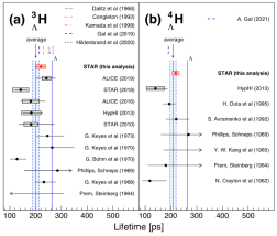 中国科学技术大学高能核物理课题组与美国劳伦斯伯克利国家实验室(LBNL)、布鲁克海文国家实验室等单位合作,在RHIC-STAR 质心能量3 GeV和7.2 GeV的重离子打靶实验中实现了超氚核(H3L)与超氢-4核(H4L)寿命目前最精确的测量,并首次测量了3 GeV能量下这两种超核的产额。以题为《Measurements of H3L and H4L Lifetimes and Yields in Au+Au Collisions in the High Baryon Density Region》,于5月17日发表在《物理评论快报》Phys. Rev. Lett. 128, 202301 (2022)上。