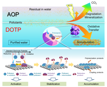 非均相催化过硫酸盐氧化技术作为一种新兴的化学氧化技术近年来发展迅速。前期的研究表明该技术体系中有机物污染物的去除过程主要是高级氧化过程(AOP)。通过文献调研,课题组的博士生张颖捷和博士后黄贵祥发现这些体系中普遍存在电子当量不守恒的现象,即污染物矿化给出的电子总量远大于氧化剂所能接受的数量。基于此矛盾现象,他们对这些体系进行了系统且深入的研究,从源头上揭示了在这些体系中实际占主导的是一种本质上与AOP不同的直接氧化转移过程(DOTP)。在DOTP中,污染物和氧化剂在非均相催化剂表面发生2电子的直接氧化还原反应,产生的污染物中间体被催化剂表面稳定化,并自发进行表面聚合反应或表面偶联反应,形成的产物富集在催化剂表面,从而实现水中污染物的有效去除。该研究阐明了反应过程中非均相催化剂表面的活化、稳定和富集三大功能,揭示了DOTP氧化剂消耗量小、污染物富集容量大、且不产生有毒副产物等优点,并展现了DOTP作为一种新的水污染控制技术用于实际废水处理的可行性。
