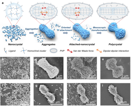 研究人员基于前期高效发光墨水制备及层层自组装圆偏振光放大策略基础上(J. Am. Chem. Soc. 2020,142, 3686?3690; J. Am. Chem. Soc.2021,143, 10860?10864),设计并合成了一系列以三乙烯二胺为结构骨架的手性配体,并使其与铜碘团簇杂化复合,构筑了一系列单一手性的结构单元。基于这一系列新型手性结构单元,在聚乙烯吡咯烷酮(PVP)的调节下,通过非经典结晶策略自组装成为具有一系列多级结构的手性多晶圆偏振发光材料。研究人员还对组装结晶的过程和机理进行了探究,清晰地揭示了结晶过程主要经历了纳米颗粒的成核、聚集、取向搭接和介观转变四个非经典结晶过程(图1)。