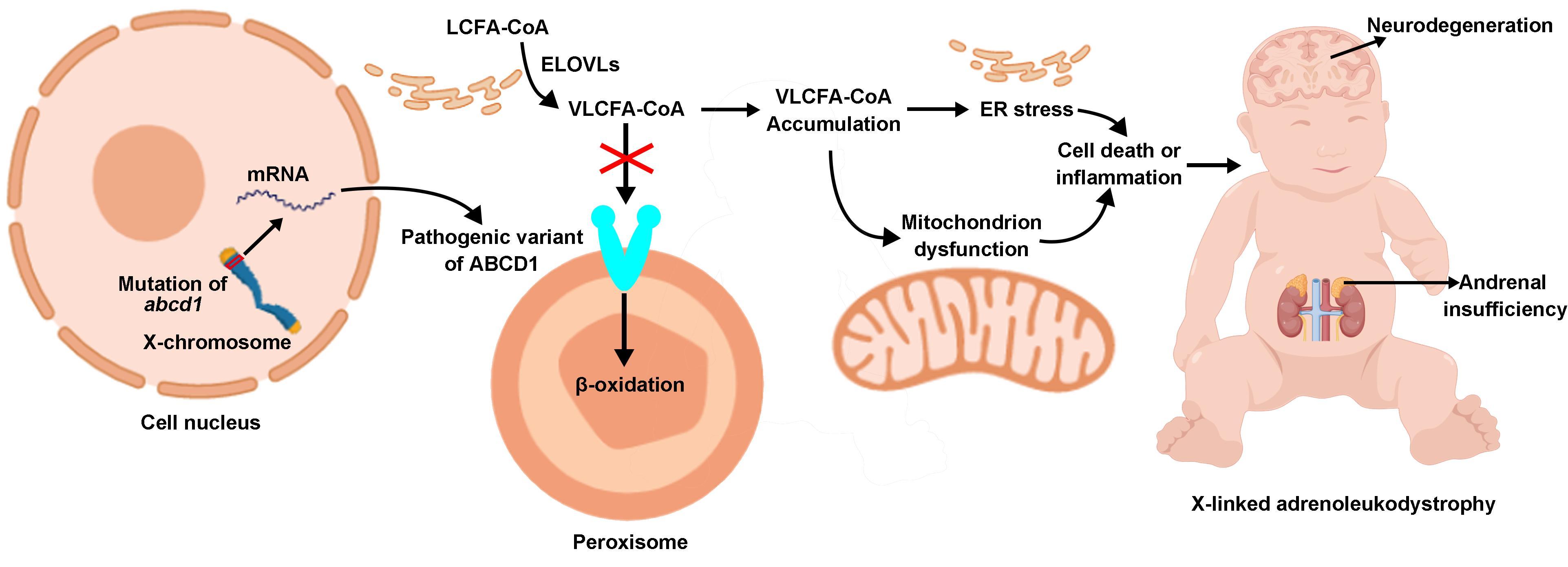 人类ABCD1属于ABC转运蛋白超家族ABCD亚家族,定位于过氧化物酶体膜上,能够利用ATP水解产生的能量将超长链脂酰辅酶A (VLCFA-CoA)从细胞质转运到过氧化物酶体中进行β-氧化。ABCD1功能缺陷会使得超长链脂肪酸在细胞中积累,导致伴X-染色体肾上腺脑白质营养不良症(X-ALD)(图1)。作为最常见的过氧化物酶体疾病,X-ALD在人群中的发病率约为1/17,000,影响人类的肾上腺、脊髓和中枢神经系统。自1993年X-ALD的致病蛋白ABCD1 被鉴定以来,人们围绕着其生理功能、底物特异性以及底物转运机制进行了大量的研究,并且鉴定了超过900个致病突变位点,但是ABCD1高分辨率三维结构的缺失极大地限制了人们对ABCD1的底物转运机制和相关突变致病机理的理解。