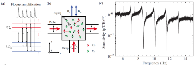 成果示意图:(a)Floquet能级;(b)Flqouet量子自旋放大器原理图;(c)磁探测灵敏度。