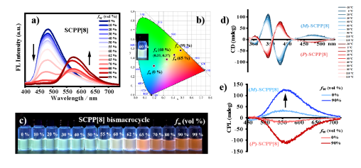 图2. (a)SCPP[8]在四氢呋喃和水混合物中的荧光光谱; (b)CIE色度图; (c)多色荧光发射照片;(d)变温圆二色谱图;(e)SCPP[8]在溶液中和聚集态的CPL图。