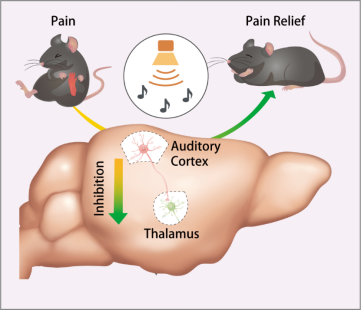 早在1960年,《Science》的论文就发现音乐能够调控情绪,即便噪音也能够产生直接的镇痛效果。然而,半个世纪以来,声音镇痛的关键因素及神经机制并不清楚。研究人员首先给予疼痛小鼠不同强度的协调音(相对于人的音乐)、非协调音(非音乐的有结构声音)以及白噪音,发现仅低强度的这三类声音均能有效缓解小鼠的疼痛。鉴于有研究提示声音的镇痛效果与治疗环境密切相关,因此研究人员通过在不同背景声音的环境下研究发现,相对于环境噪音约5-dB的声强差(SNR)对声音的镇痛效应至关重要。至此,研究人员建立了声音镇痛的小鼠模型。
