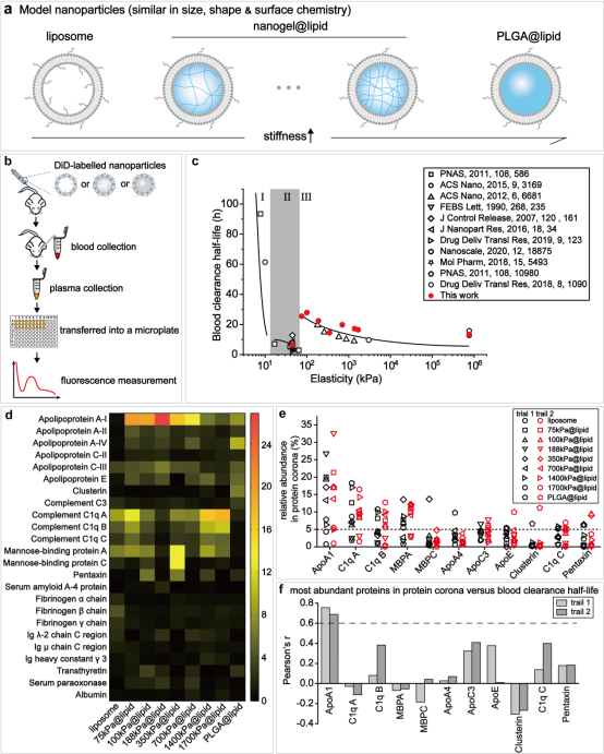 图1.a大小、形状和表面化学等相同但弹性不同的模式纳米颗粒。b获取纳米颗粒血液滞留曲线的血液循环测试示意图。c纳米颗粒的血液清除半衰期与纳米颗粒弹性的关系曲线。d不同弹性纳米颗粒的蛋白冠中蛋白质相对丰度热图。e至少在一个纳米颗粒的蛋白冠中相对丰度大于5%的蛋白在不同颗粒蛋白冠中的相对丰度分布。h蛋白在不同颗粒蛋白冠中相对含量与颗粒血液清除半衰期的相关性系数Pearson’s r。