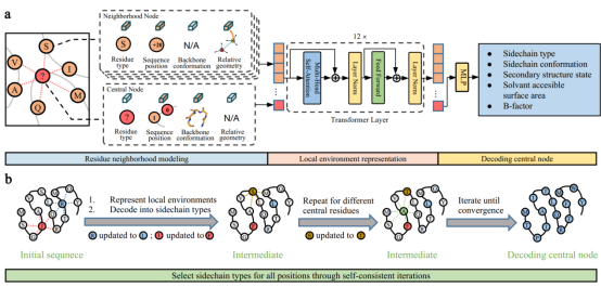 图1. 用ABACUS-R模型进行蛋白质序列设计的原理。(a) 预训练的编码器-解码器网络;(b)采用自洽迭代策略进行全序列从头设计。