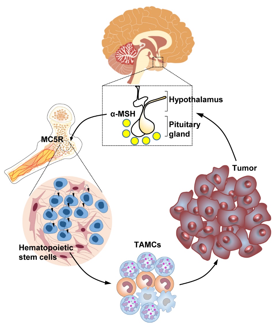 8月4日,中国科学技术大学生命科学与医学部周荣斌、江维教授团队与转化医学与创新药物国家重点实验室唐任宏团队合作,在Science以“First Release”的形式在线发表题为“Pituitary hormone α-MSH promotes tumor-induced myelopoiesis and immunosuppression”的“Research Article”研究论文,报道了下丘脑-垂体轴及其产生的激素α-MSH在介导肿瘤诱导的髓系造血和免疫抑制中的关键作用。