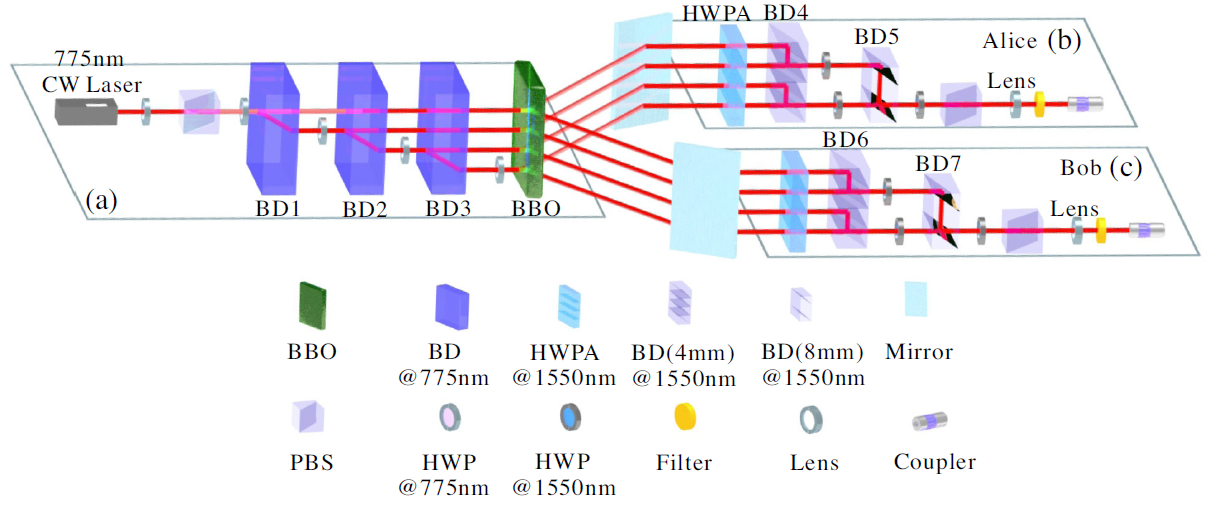 在本实验中,研究组在高维纠缠光子的探测效率方面取得突破,实现了无探测漏洞的高维贝尔不等式检验。研究组采用波长775纳米的激光泵浦beamlike切割的非线性晶体得到波长1550纳米的纠缠光子,这种切割方式可以有效增大纠缠光子的收集效率,并采用了透过率达到99%的滤波装置和探测效率90%的超导单光子探测器,并且所有光学元件的基片都采用了在1550纳米吸收率极低的光学玻璃,由此最终实现了总体探测效率达71.7%的四维纠缠光子态,该探测效率远高于关闭四维贝尔不等式探测漏洞所需的阈值61.8%,同时四维纠缠光子态的保真度达到了99.5%。通过合理选择参数,研究组在国际上首次实现了无探测漏洞的高维贝尔不等式检验。该成果为进一步实现同时关闭探测漏洞和非局域性漏洞的高维贝尔不等式检验及设备无关的高维量子通信过程奠定重要基础。