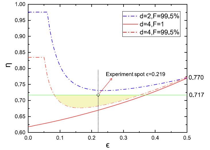 图2:实现无探测漏洞的贝尔不等式检验所需的探测效率对比图。在保真度均为99.5%时,四维纠缠态的探测效率需求明显低于两维纠缠态的探测效率需求。