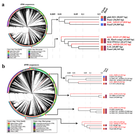 通过在水华爆发季节从巢湖采集水样,作者首先从巢湖水体中分离和放大培养了一株伪鱼腥藻Chao 1806;并以此为宿主,筛选分离得到五株尾部形态各异的淡水噬藻体Pam1~Pam5(图一)。全基因组测序表明,这五株噬藻体的双链DNA基因组长度在36到142 Kb之间。随后的比较基因组学和系统发育分析表明,Pam1~Pam5具有不同的DNA包装机制,且在进化上是相互独立的。利用宏基因组学分析手段,作者计算了它们在巢湖南淝河口水体中的相对丰度,结果表明短尾噬藻体Pam1和Pam5占主体。进一步,作者以Pam1~Pam5和先前报道的其它淡水噬藻体基因组做参考基因组,从巢湖水体的宏基因组数据中聚类出10个新的尚未培养的淡水噬藻体重叠群(图二)。基于上述分析,作者提出了一种基于现有宏基因组数据以及有限的实验分离噬藻体的参考基因组的高通量鉴定新噬藻体的策略,可应用于系统性挖掘未培养的噬菌体或病毒的完整或部分基因组。结合合成生物学手段,将体外合成的基因组转化适当宿主,可以得到大量新的噬藻体,大大丰富地球上已知微生物库。