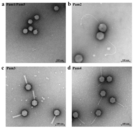 图一 巢湖分离的五株淡水噬藻体Pam1~Pam5形态图