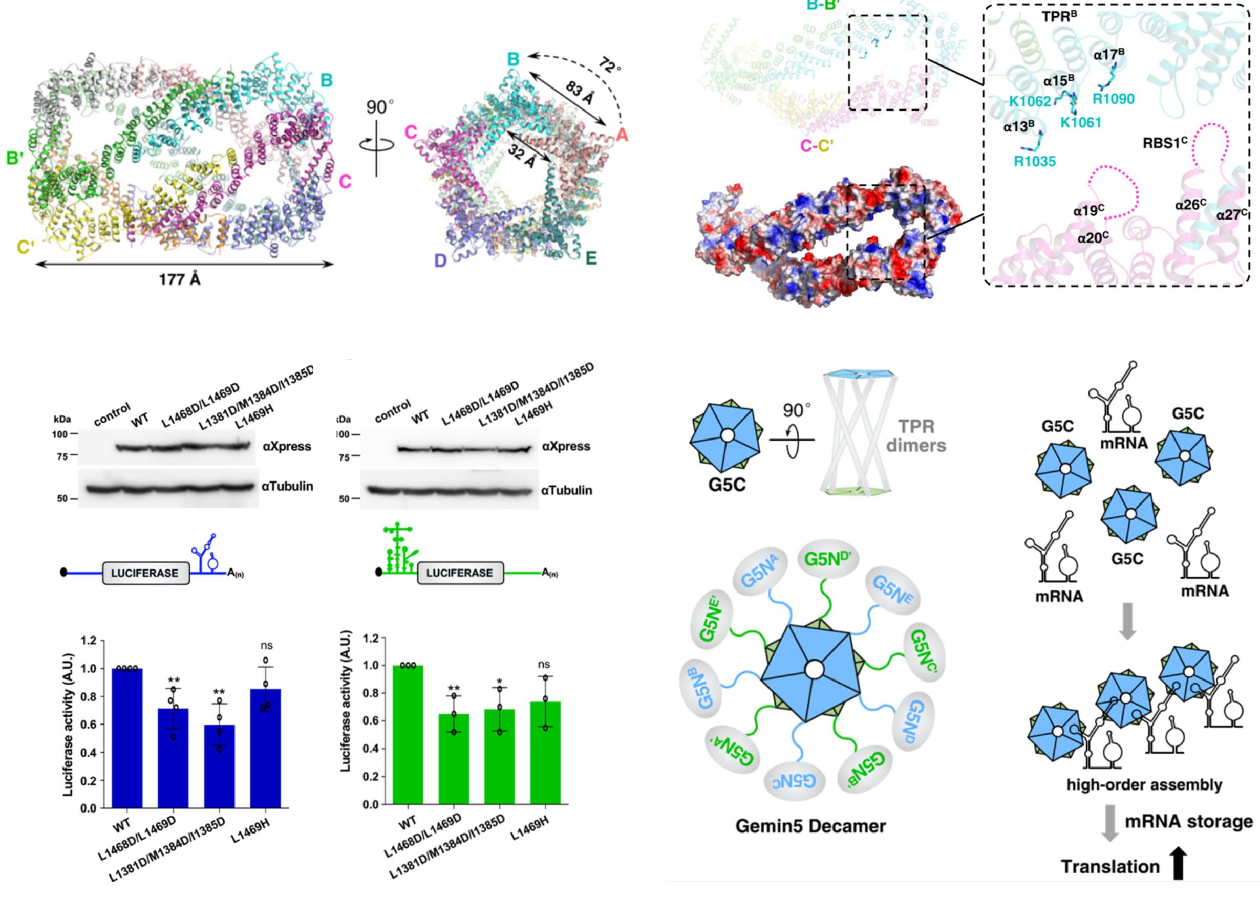 结构生物学、生物化学、突变及细胞生物学实验表明:(1)破坏五聚体界面的突变无一例外的减弱G5C与mRNA的结合,表明G5C五聚体/十聚体形成对结合mRNA是必需的;(2)G5C十聚体通过内部相邻G5C的TPR结构域之间带正电狭长口袋结合mRNA;(3)细胞内破坏G5C五聚体/十聚体形成的突变,以及G5C TPR结构域带正电氨基酸的突变,都影响Gemin5调控mRNA翻译的功能;(4)Gemin5基因的部分致病突变预测将破坏G5C的十聚体形成,或成为导致神经系统疾病的重要原因。该研究解析了G5C十聚体作为一个整体结合自身mRNA并调控mRNA翻译的机制,为进一步研究Gemin5缺陷导致神经系统疾病的机理以及Gemin5独立于SMN复合物的生物学功能提供了结构基础。