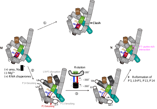 在从 M 到 N 的转变过程中,J7/3 和 J8/7 的交叉使得从 M 到 N 的直接转变在立体化学上是不可能的 (①)。 一个可能的 M-to-N 重折叠途径涉及 P3 和外周三级作用位点(例如 L9-P5、P13、P14)的瞬时断裂,这可以受许多因素的调节(②)。这些瞬时断裂将允许 P8 旋转,使 J7/3 和 J8/7 进入正确位置 (③)。 P3 重组和 P7 旋转将使 P7 与 P9.1 螺旋靠近,形成 P7多嘌呤相互作用并实现天然拓扑结构 (④)。