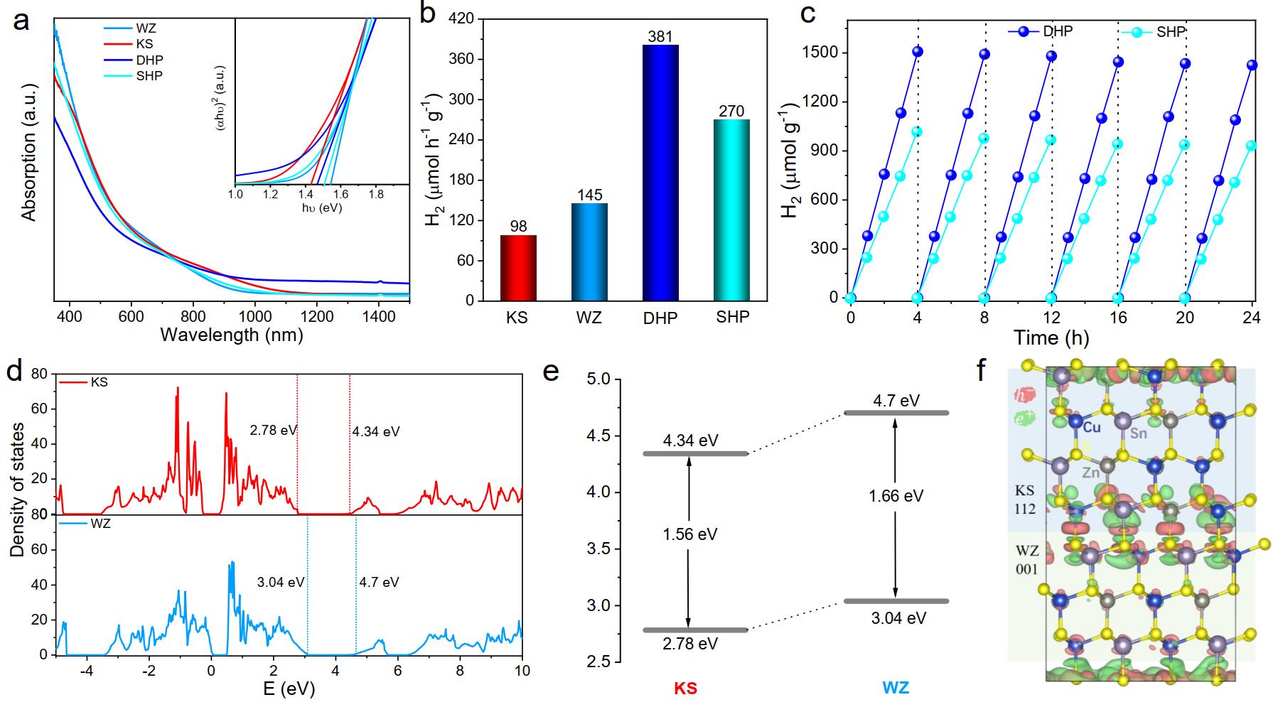 图2.CZTS纳米晶的光学和光催化性能。(a)紫外-可见-近红外吸收光谱;(b)CZTS纳米晶在可见光下的光催化析氢性能;(c) CZTS多形体的循环光催化产氢性能;(d)多形体结构中WZ和KS相的态密度图;(e)多形体中WZ和KS相带隙排列;(f) 杂化组合的模拟电荷分布。