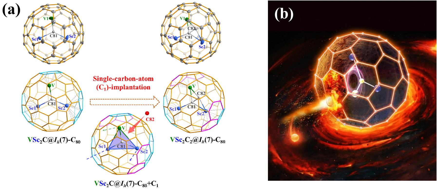 图注.(a) VSc2C@Ih-C80和VSc2C2@C80的单晶结构图以及自驱动单原子碳注入机制示意图。(b)单原子碳注入过程效果图,形象地表示了在内嵌金属团簇形成的“黑洞”的吸引下,外部单原子碳(黄色)穿透富勒烯碳笼的过程,最终该单原子碳与碳笼内部的钒(白色)、钪(蓝色)及中心碳原子成键。