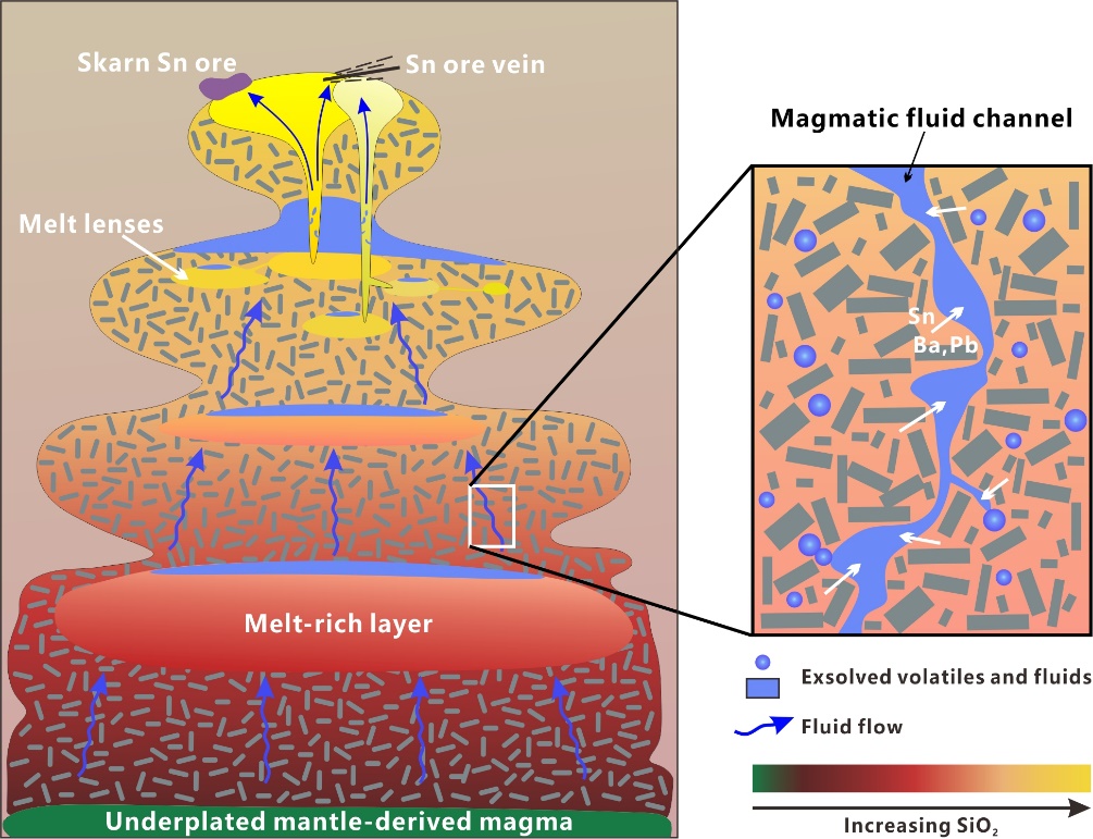 华南侏罗纪骑田岭花岗岩和钨锡成矿关系密切,是我国著名的锡多金属矿床产地。在前期建立的高精度金属稳定同位素分析方法的基础上,该团队发现骑田岭花岗岩具有很轻的Ba同位素组成,和Sn的富集紧密相关。这个结果表明在岩浆-热液演化过程中,具有低δ138/134Ba的深部岩浆流体可以有效地将富集于不同深度的Sn运移至岩浆房顶部,为大型/超大型Sn矿床提供物质来源(图1),从而解决了长期争议的Sn来源问题。