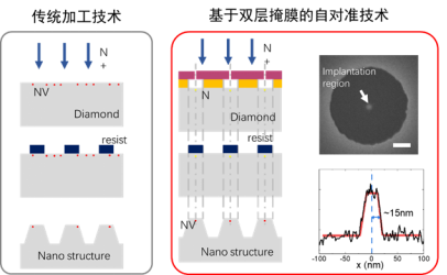 制备高性能金刚石量子器件是金刚石量子信息技术实用化的关键技术。以金刚石量子传感器为例,其原理是利用器件内的NV色心将外界的微弱物理信号转换为自身荧光强度信号来进行探测,因此在不牺牲其他物理性质前提下,提高NV色心光子计数率是提升传感器性能的一个关键指标。在过去几年中,人们积极致力于开发用于提高NV色心荧光强度的金刚石微纳米光子学结构,例如固体浸没透镜、柱形波导、圆形牛眼光栅、抛物面反射器、倒置纳米锥等。但目前传统的制备技术无法精确控制微纳米结构中NV色心位置,导致器件制备效率低下,性能难以达到预期(图2(a)),其主要原因是NV色心制备工艺和金刚石结构刻蚀工艺之间的对准难题(图1左)。通常这一对准精度需要优于20纳米,方能达到光学器件理论上最优的光学性能。