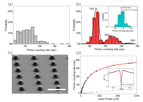 图2:器件制造效果展示。(a)传统工艺制造器件光学计数率分布;(b)自对准工艺制造器件光学计数率分布;(c)金刚石纳米柱传感阵列电镜照片;(d)单个NV色心荧光饱和曲线测试。