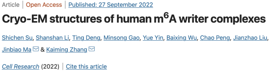 2022年9月27日,中国科学技术大学生命科学与医学部张凯铭团队与复旦大学生命科学学院麻锦彪团队和合作在Cell Research杂志在线发表了题为《Cryo-EM structures of human m6A writer complexes》的文章,该研究首先体外获得了MACOM和MAC复合物(图1b-c),然后通过冷冻电镜解析了两套分辨率在3.0 ?的人源m6A甲基化酶调控亚基复合物MACOM的核心区域原子水平结构(图1f-g),以及整体分辨率为4.4 ?的人源m6A甲基化酶MAC-MACOM复合物整体结构。研究团队结合蛋白质-蛋白质和蛋白质-RNA交联质谱以及pull-down等生化实验与结构分析,阐明了MACOM复合物结构核心区域的组成及结构细节,并提出了MAC-MACOM甲基化修饰RNA的合理模型。