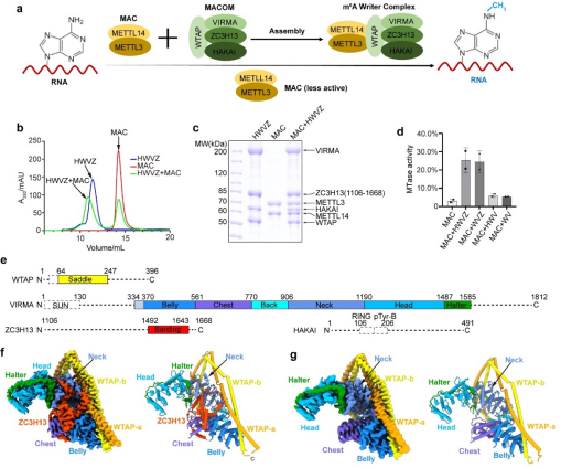 在RNA上存在多种修饰,其中腺嘌呤N6位甲基化(m6A)修饰是哺乳动物中丰度最高、分布最广的RNA修饰。研究发现m6A修饰在mRNA的编码区和3’ -UTR区域富集,参与多种生理及病理过程的调控。RNA的m6A修饰依赖由多个蛋白成员组成的m6A甲基化酶完全复合物(Holo-complex),其中由MT-A70家族蛋白METTL3和METTL14形成异源二聚体组成的催化亚基被称作m6A-METTL复合物(m6A-METTL complex,简称MAC);而WTAP、VIRMA(KIAA1942)、ZC3H13和HAKAI等主要起调控作用,并存在明显的相互作用,它们组成的调控亚基被称作m6A-METTL关联复合物(m6A-METTL associated complex,简称为MACOM)(图1a)。缺少MACOM时,MAC只显示相对较低的体外m6A修饰活性(图1c),因此MACOM对MAC的m6A甲基化酶活性具有重要的调控作用。虽然组成MAC核心的METTL3/14催化结构域以及METTL3的锌指结构已被解析1-4,但是对于调控复合物MACOM及其成员蛋白,仍缺乏任何结构信息,极大阻碍了对其功能和对催化亚基MAC活性的调控机制研究。