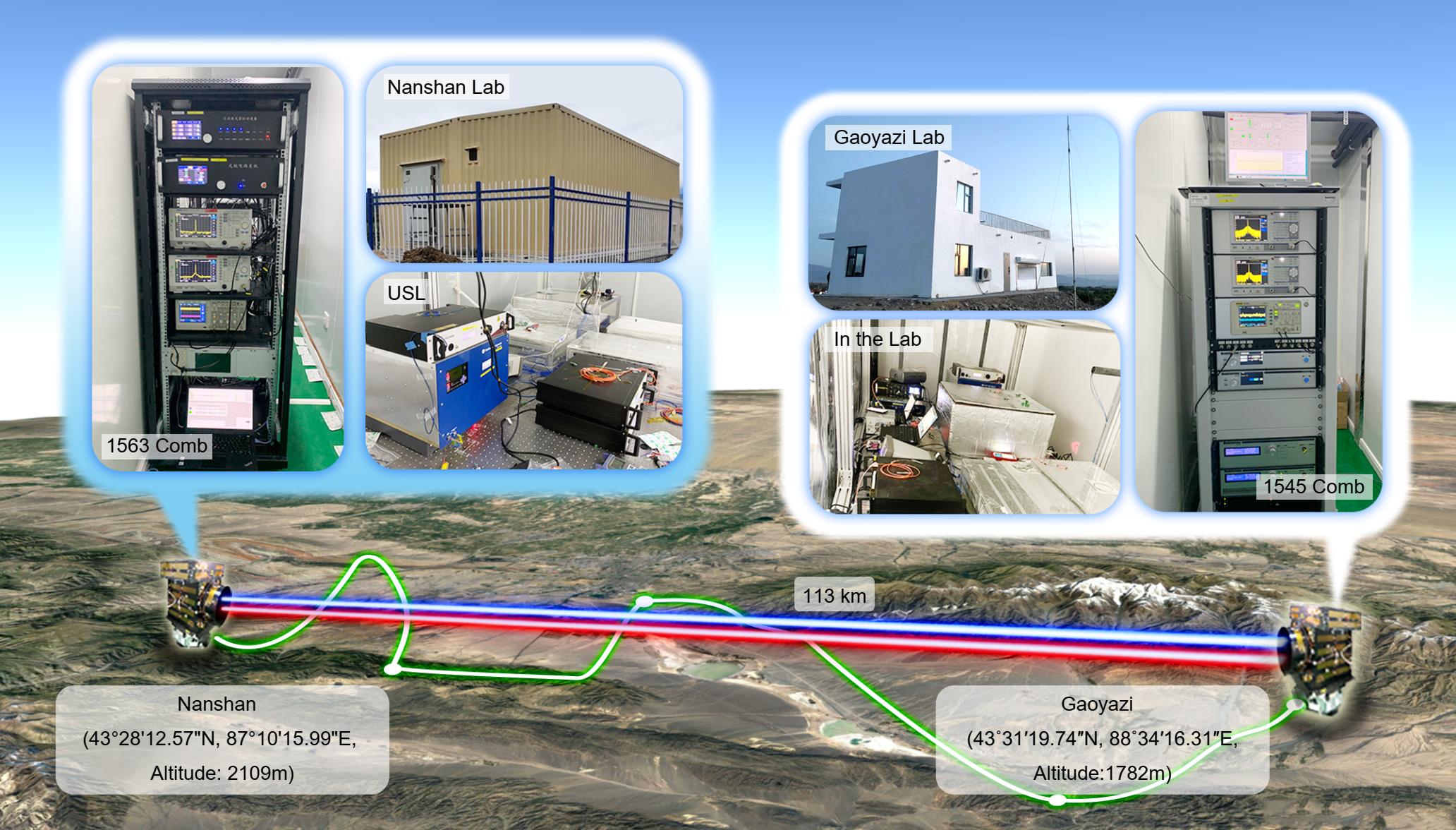 在本工作中,研究团队发展了全保偏光纤飞秒激光技术,实现了瓦级功率输出的高稳定光频梳;基于低噪声平衡探测和集成干涉光纤光路模块,结合高精度相位提取后处理算法,实现了纳瓦量级的高灵敏度线性光学采样探测,单次时间测量精度优于100飞秒;进一步提升了光传输望远镜的稳定性和接收效率。在上述技术突破的基础上,研究团队在新疆乌鲁木齐成功实现了113公里自由空间时频传递,时间传递万秒稳定度达到飞秒量级,频率传递万秒稳定度优于4E-19,系统相对偏差为6.3E-20±3.4E-19,系统可容忍最大链路损耗高达89dB,远高于中高轨星地链路损耗的典型预期值(约78dB),充分验证了星地链路高精度光频标比对的可行性。