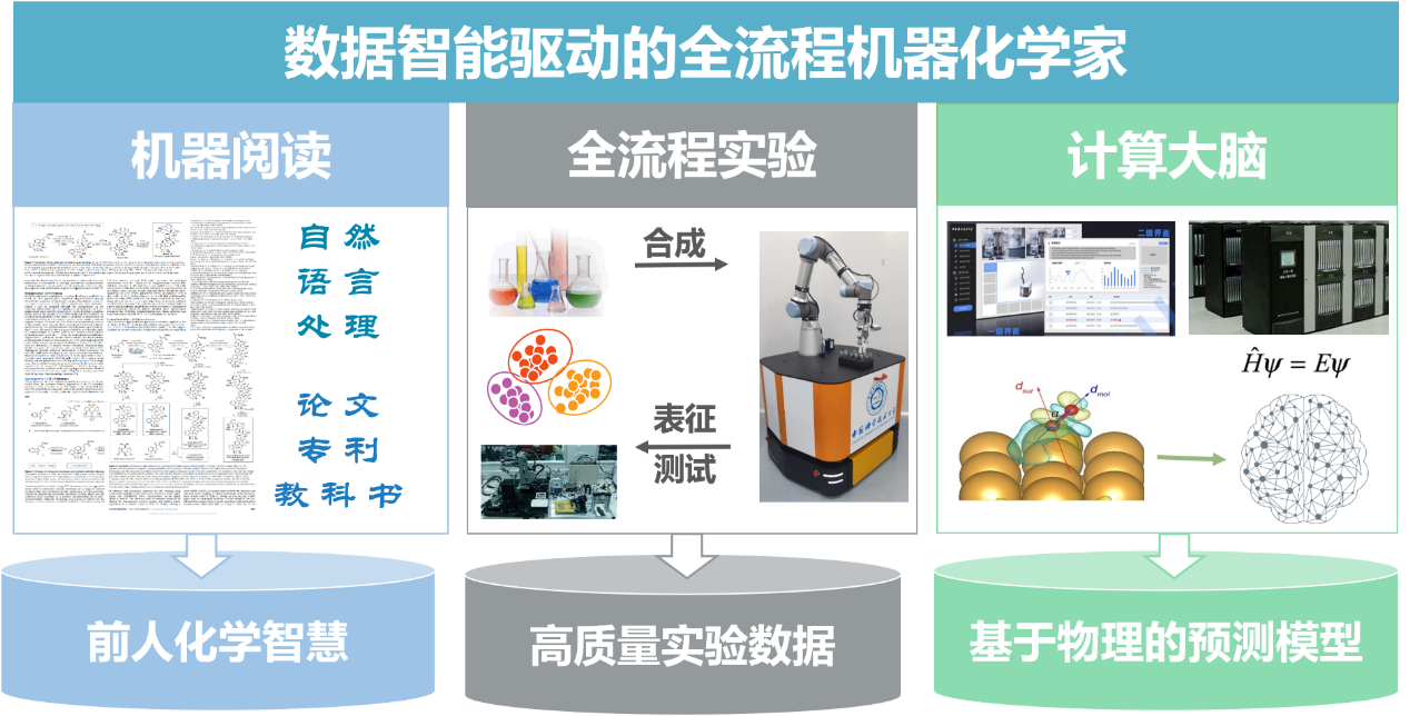 在中国科学院“数据驱动的化学、材料和生物科学的机器科学家”青年团队计划和国家自然科学基金委项目(批准号:22025304, 22033007)的资助下,中国科学技术大学化学与材料科学学院罗毅、江俊教授团队与自动化系尚伟伟等合作,通过开发和集成移动机器人、化学工作站、智能操作系统、科学数据库,研制出数据智能驱动的全流程机器化学家(图1,视频链接:https://faculty.ustc.edu.cn/jiangjun1/en/zdylm/661330/list/index.htm)。相关研究成果于2022年9月发表在《国家科学评论》(Natl. Sci. Rev.)上。文章链接:https://academic.oup.com/nsr/advance-article/doi/10.1093/nsr/nwac190/6694008。